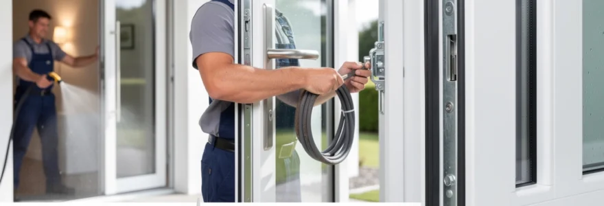 L’étanchéité à l’eau se contrôle par un test d’arrosage maîtrisé, similaire à celui utilisé lors du diagnostic mais cette fois réalisé après remplacement des joints. Arrosez la face extérieure de la porte pendant plusieurs minutes, en insistant sur les angles et le seuil, puis inspectez minutieusement l’intérieur pour détecter la moindre trace d’humidité. Pensez à vérifier également les chambres de drainage du dormant : elles doivent évacuer l’eau vers l’extérieur sans stagnation excessive.