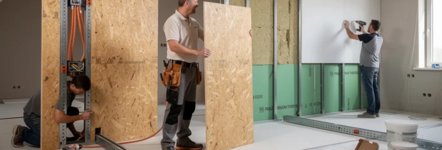 Le choix entre l’OSB et le placo pour vos cloisons intérieures représente une décision technique majeure qui influence directement la performance, l’esthétique et la durabilité de vos aménagements. Cette question se pose de plus en plus fréquemment dans les projets de construction et de rénovation, notamment avec l’essor des matériaux biosourcés et l’évolution des normes de construction. L’OSB (Oriented Strand Board) séduit par son aspect naturel et sa résistance mécanique exceptionnelle, tandis que le placo reste la référence en matière de finition lisse et de facilité de mise en œuvre. Chaque matériau présente des caractéristiques techniques spécifiques qui répondent à des besoins différents selon l’usage prévu, les contraintes réglementaires et les exigences de performance thermique et acoustique.